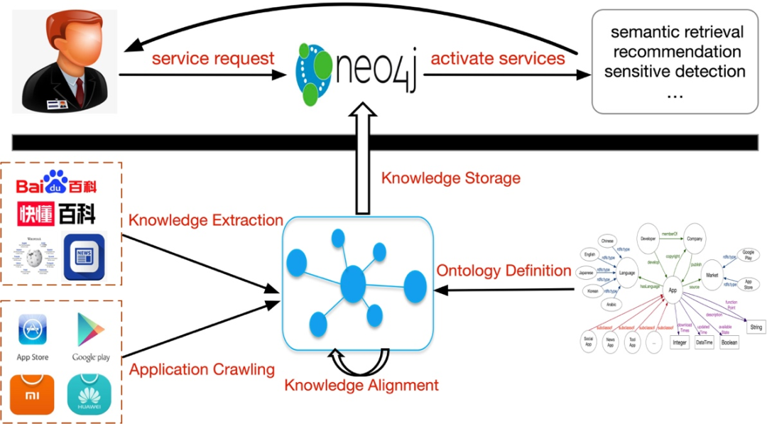 知识存储:基于我们设计的本体,利用爬取的数据实例化关系与属性取值,并利用知识抽取和知识对齐来丰富知识图的结构化三元组。然后,通过Jena将它们转换为具有指定URL的结构化三元组{(h, r, t)}。对于知识存储,我们使用Neo4j来存储转换后的三元组,这是一种能够高效存储RDF三元组的图数据库,并提供配套查询语言Cypher。为了让MAKG与移动应用商店里的数据保持同步,我们定期更新APP的描述性信息,并记录更新到日志中。