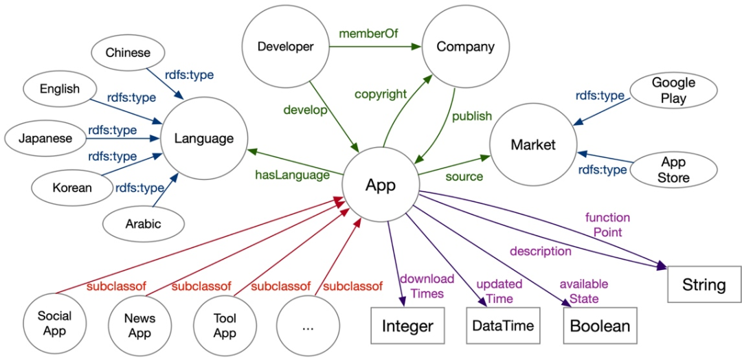 图2为我们定义的轻量级本体,其中红色边和蓝色边分别表示子类(subclassOf)和实例类型(rdfs: type)两个基本关系。此外,绿色边代表关系,紫色边代表属性。我们在本体中一共定义了26个基本概念、11个关系和45个属性。得益于定义良好的本体,不仅可以在查询过程中为APP在网络安全分析师和用户呈现更全面的属性,还可以在APP之间产生更多共享链接。