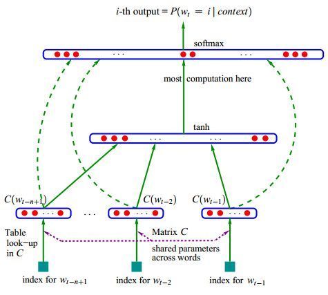 分布式表示的最大优点在于它具有非常强大的表征能力,比如n维向量每维k个值,可以表征k的n次方个概念。下图的神经网络语言模型(NNLM)采用的就是文本分布式表示。而词向量(word embedding)是训练该语言模型的一个附加产物,即图中的Matrix C。