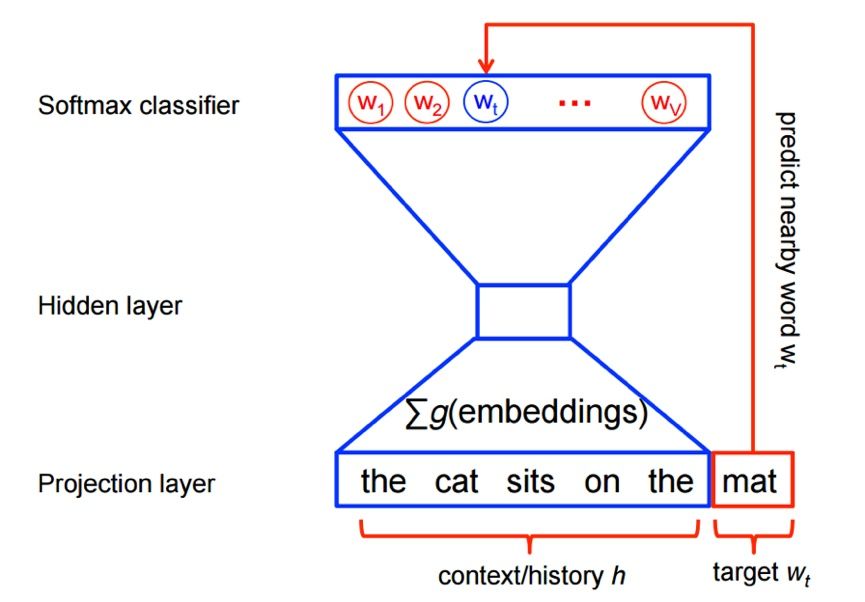 以(CBOW)为例,如果有一个句子“the cat sits one the mat”,在训练的时候,将“the cat sits one the”作为输入,预测出最后一个词是“mat”。