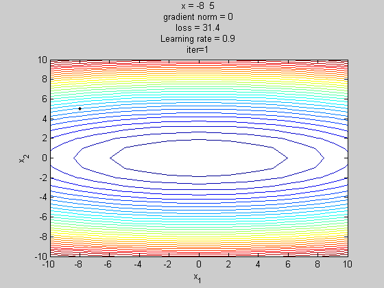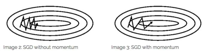 其中m是momentum项(一般设定为0.9)。主要是用在计算参数更新方向前会考虑前一次参数更新的方向,如果当下梯度方向和历史参数更新的方向一致,则会增强这个方向的梯度,反之,则梯度会衰退。然后每一次对梯度作方向微调。这样可以增加学习上的稳定性(梯度不更新太快),这样可以学习的更快,并且有摆脱局部最佳解的能力。如下图所示:
