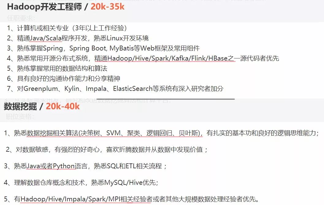 目前,普通的Hadoop大数据工程师起薪也在20K/月,稍有经验薪资还要多几千,数据挖掘、机器学习、人工智能相关人才薪资更高。