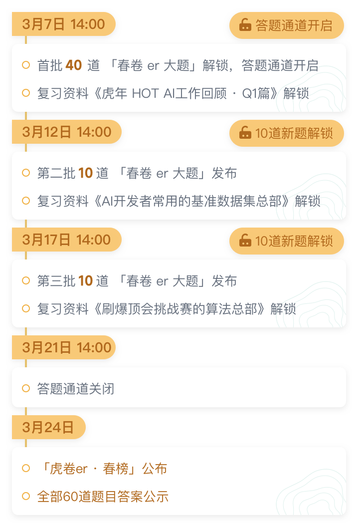 老伙计们可以在 3 月 7 日至 3 月 21 日中的任意时间进行答题;在 3 月 7 日、3 月 12日、3 月 17 日分别会有新题和复习材料解锁。想要「榜上有名」的老伙计别忘了回来答新题哦~