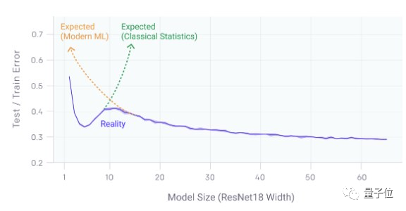 误差会先随着模型的增大而减小,然后经过模型过拟合,误差又增大,但随着模型大小或训练时间的进一步增加,误差又会再次减小。