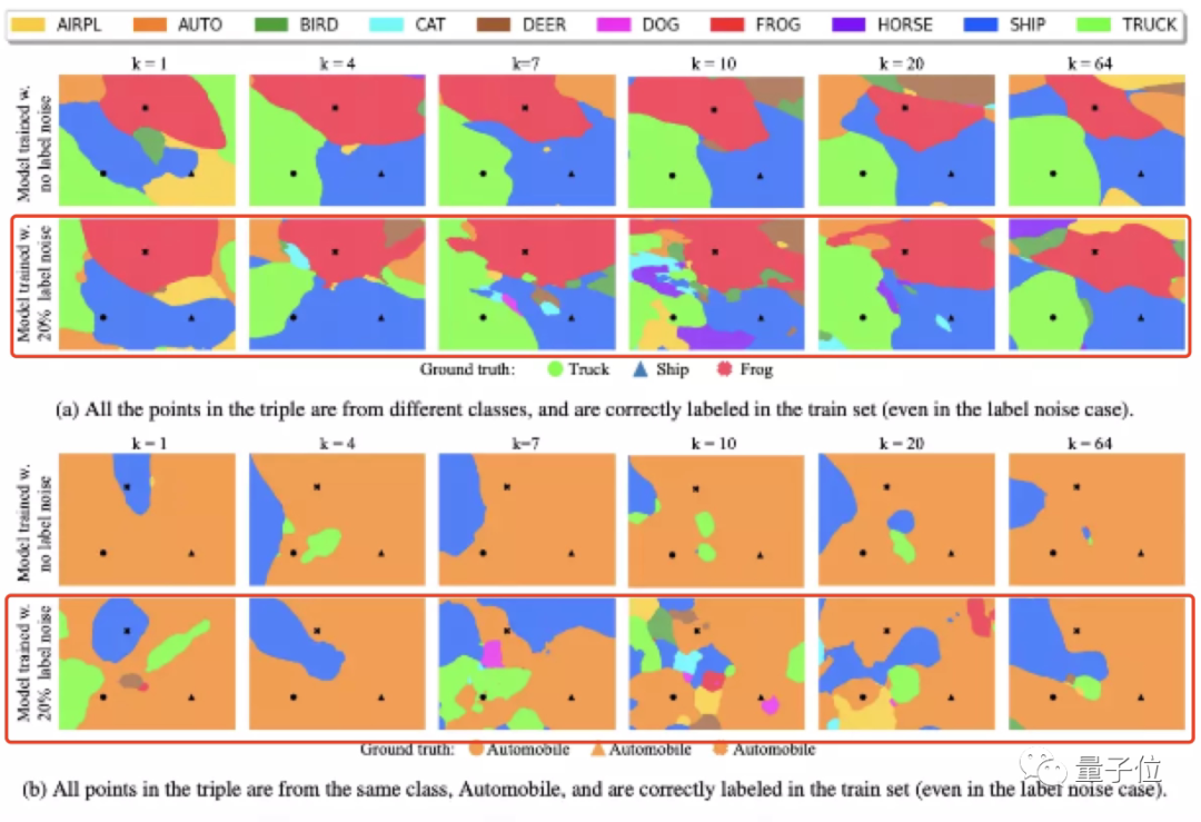 训练出的两组模型,其中一组使用无噪声标签(label noise)的训练集,另一组则带有20%的噪声标签。