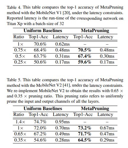 下表中,旷视研究员对比了在 latency constraint 相同的情况下,MetaPruning 与MobileNet V1/V2 的精度,数据显示 MetaPruning 大幅超越人工裁剪的精度。