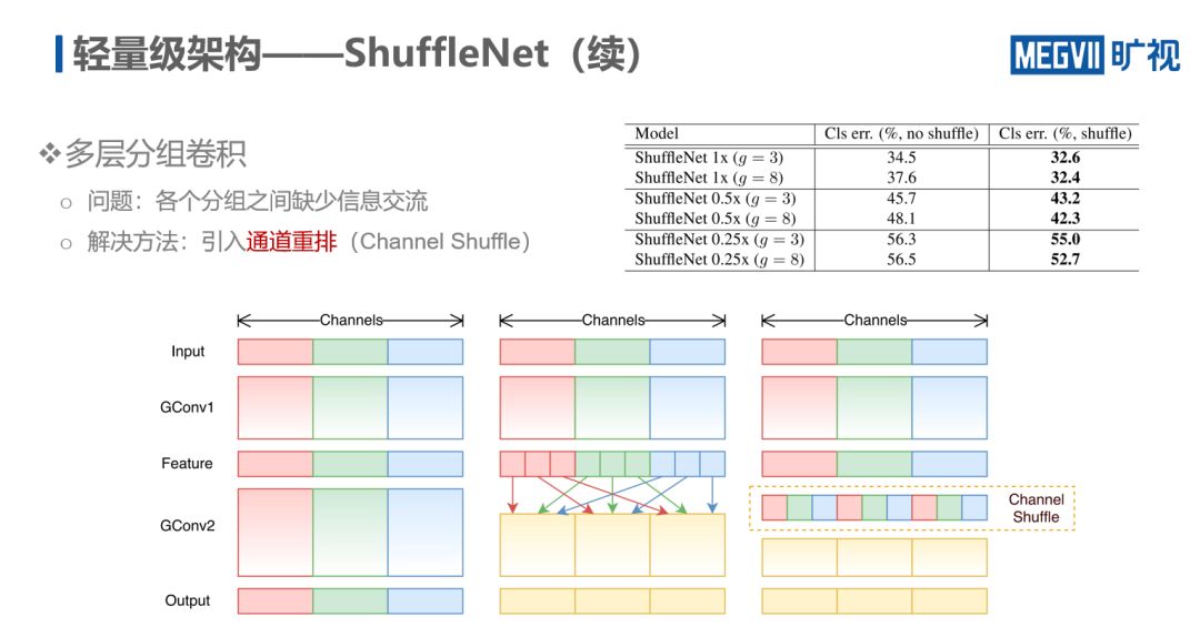 如下图所示,在分组卷积的情况下,每一个辅助的通道都是来自于输入通道的一部分,即每一个 GConv 都是输出通道的一部分。当对这些分组卷积进行打乱并重新组合以后,通道之间的信息便得到了交换。由下图数据可知,引入通道重排后模型的错误率显著下降。
