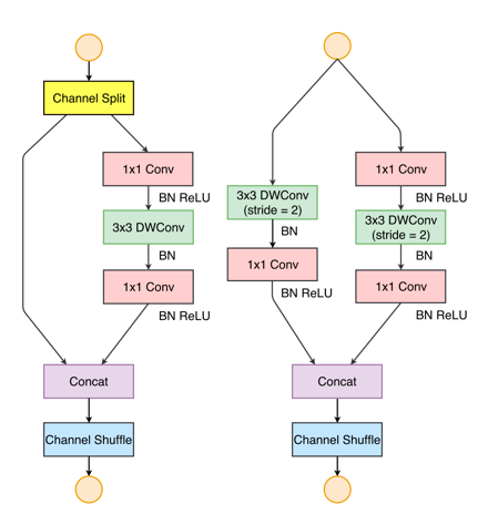 需要注意的是,ShuffleNet V2 包含了部分逐点运算结构,如下图的 Channel Split、Contact、Channel Shuffle。对于这些结构而言,一些高度优化的模块可以将其融合成一个操作,进而大幅提升速度。