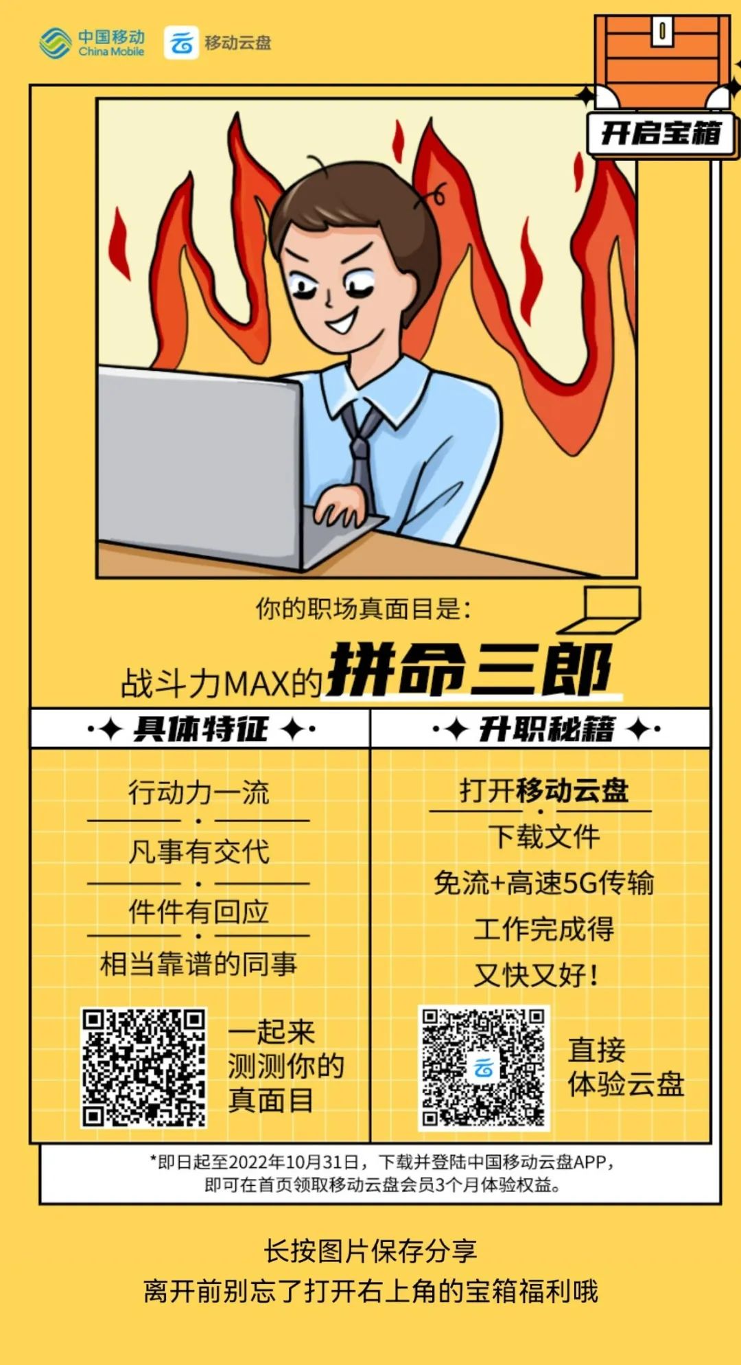 最近,中国移动云盘上线了一个趣味职场测试,通过一系列趣味问答,测试用户的职场属性,问题设置轻松有趣,比如周末怎么安排、在吃饭时收到领导的信息回不回复、对象发信息抱怨手机内存不够怎么办。