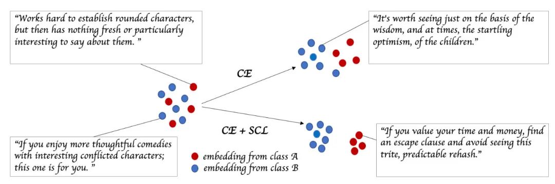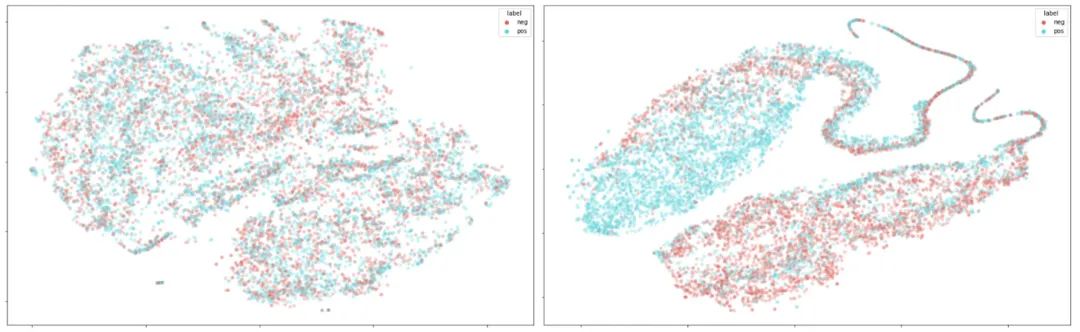 除了开头展示的直接提升外,作者还进行了很多分析。从SST-2数据集的[CLS] embedding来看,通过CE(左)和SCL(右)损失训练出来的encoder对正负例的区分能力确实有不少差距: