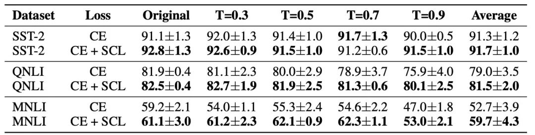 同时在有噪声的训练数据上SCL鲁棒性会更强(T越高噪声越多):