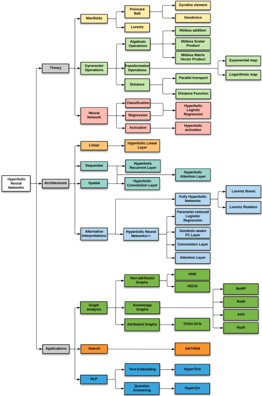 Chami, I., Ying, Z., Ré, C., & Leskovec, J. (2019). Hyperbolic graph convolutional neural networks. Advances in neural information processing systems, 32, 4868-4879. (pdf) Ganea, O. E., Bécigneul, G., & Hofmann, T. (2018). Hyperbolic neural networks. Advances in neural information processing systems, 5345-5355. (pdf) Shimizu, R., Mukuta, Y., & Harada, T. (2021). Hyperbolic neural networks++. Interna