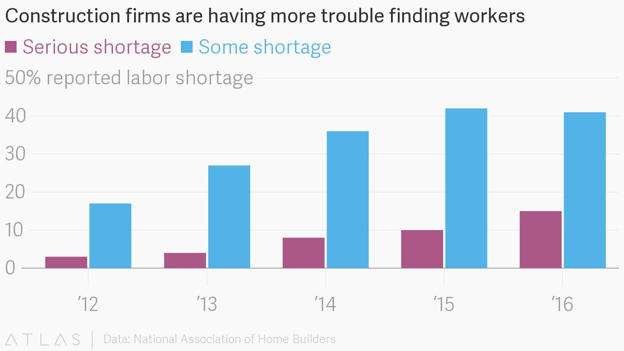 尽管自动化的技术趋势被视为扼杀运输行业和零售行业就业机会的重要力量,但建筑行业也面临熟练工人短缺的问题。根据美国承包商协会(Associated General Contractors of America)的一项调查显示,美国 80% 的建筑公司在寻找合格的熟练工人时都面临困难。