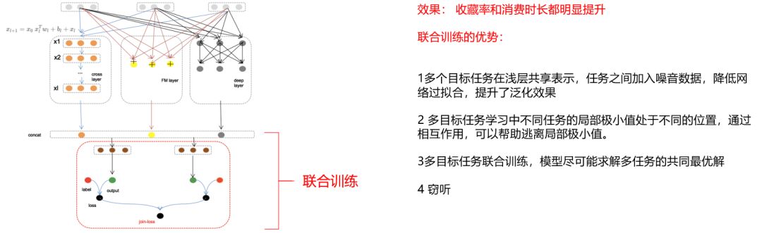 在上图中,我们首先在网络层保证了各项输出,并实现了浅层共享表示。因此,在训练效果上,虽然目标之间也存在一定的差异性,但是随着我们引入了差异网络进行训练,收藏率和消费时长都得到了明显的提升。