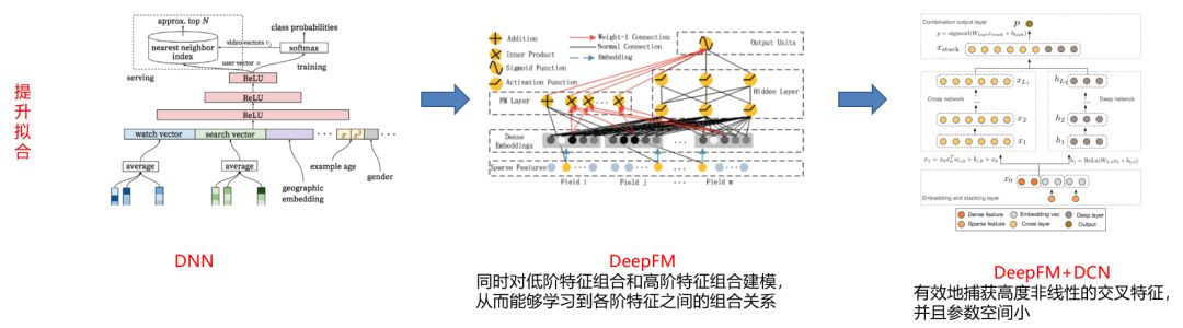 为了增加后续的表达能力,我们采用了深度神经网络,包括:DNN、DeepFM 以及 Wide&Deep 等模型。