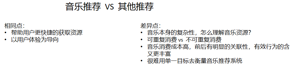 差异:可重复消费与不可重复消费的不同之处。解决:利用音乐的消费特性,去智能地分析不同歌曲之间的关联性。