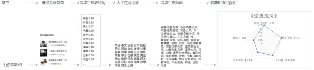 在此基础上,我们再根据人工过滤的词汇表,自动生成诸如:“网络的华语女声”、“香港民谣歌曲”等短语。