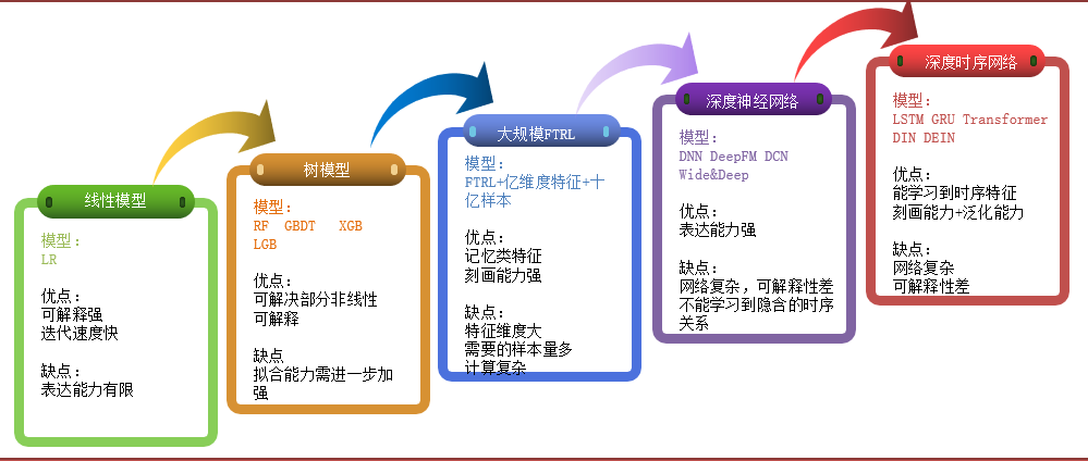 如上图所示,我们经历了从一开始的线性模型、到树模型、到大规模 FTRL、再到深度神经网络、最后到深度时序网络,这么一个音乐推荐方面的迭代过程。
