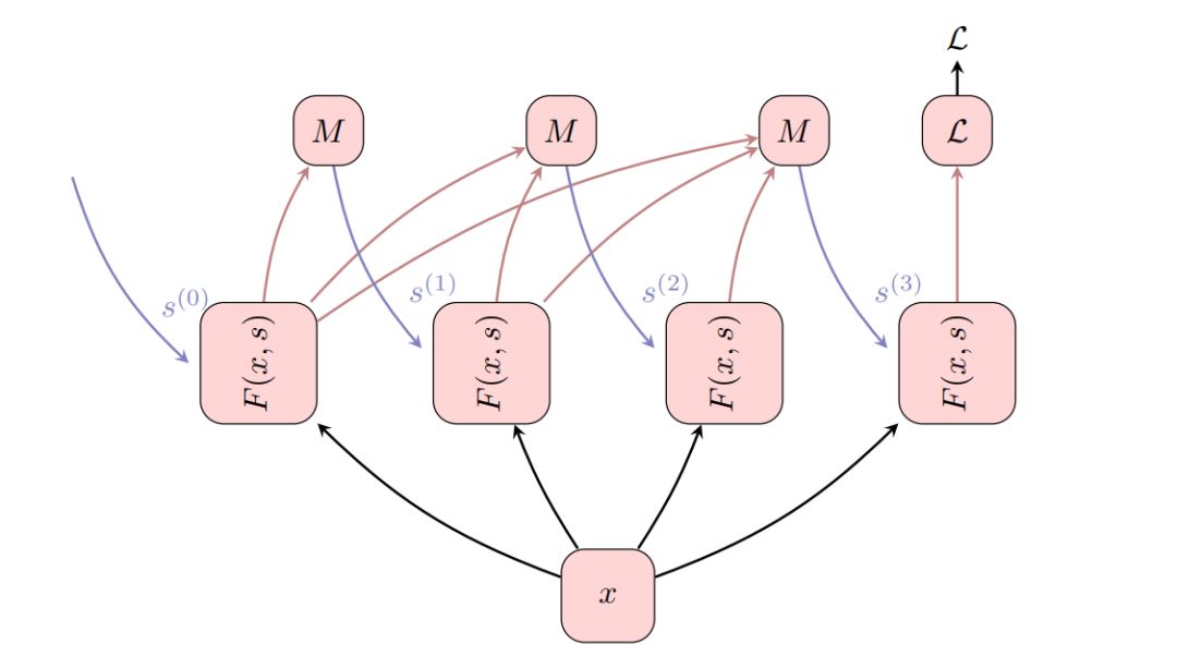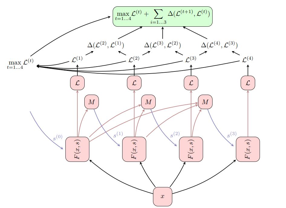 图1:运行4个时间步长的ThinkNet示意图(在状态依赖函数F(x, s)上实现)。在t=0时,网络以状态s(0)进行初始化。在 t > 0时,混合函数M根据之前的时间步长t、t-1、……、1生成的所有输出来计算下一个状态s(t+1)。最终,在流程的最后计算损失L。