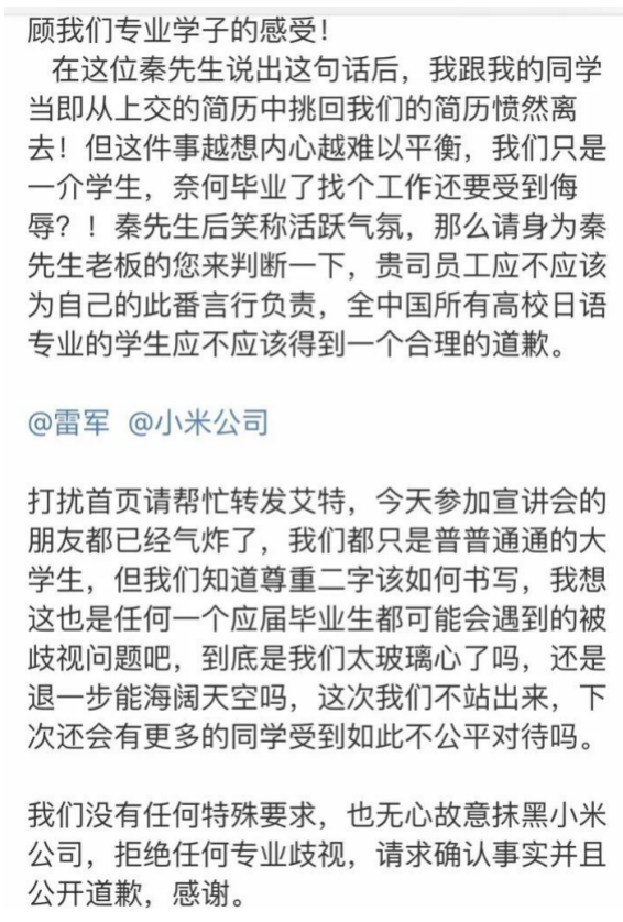 2017年9月22下午,小米公司在郑州大学宣讲会上,一名代表小米公司进行宣讲的秦先生表示“如果你们是日语专业的学生,那你可以走了。或者可以送你们去那里从事电影事业!”