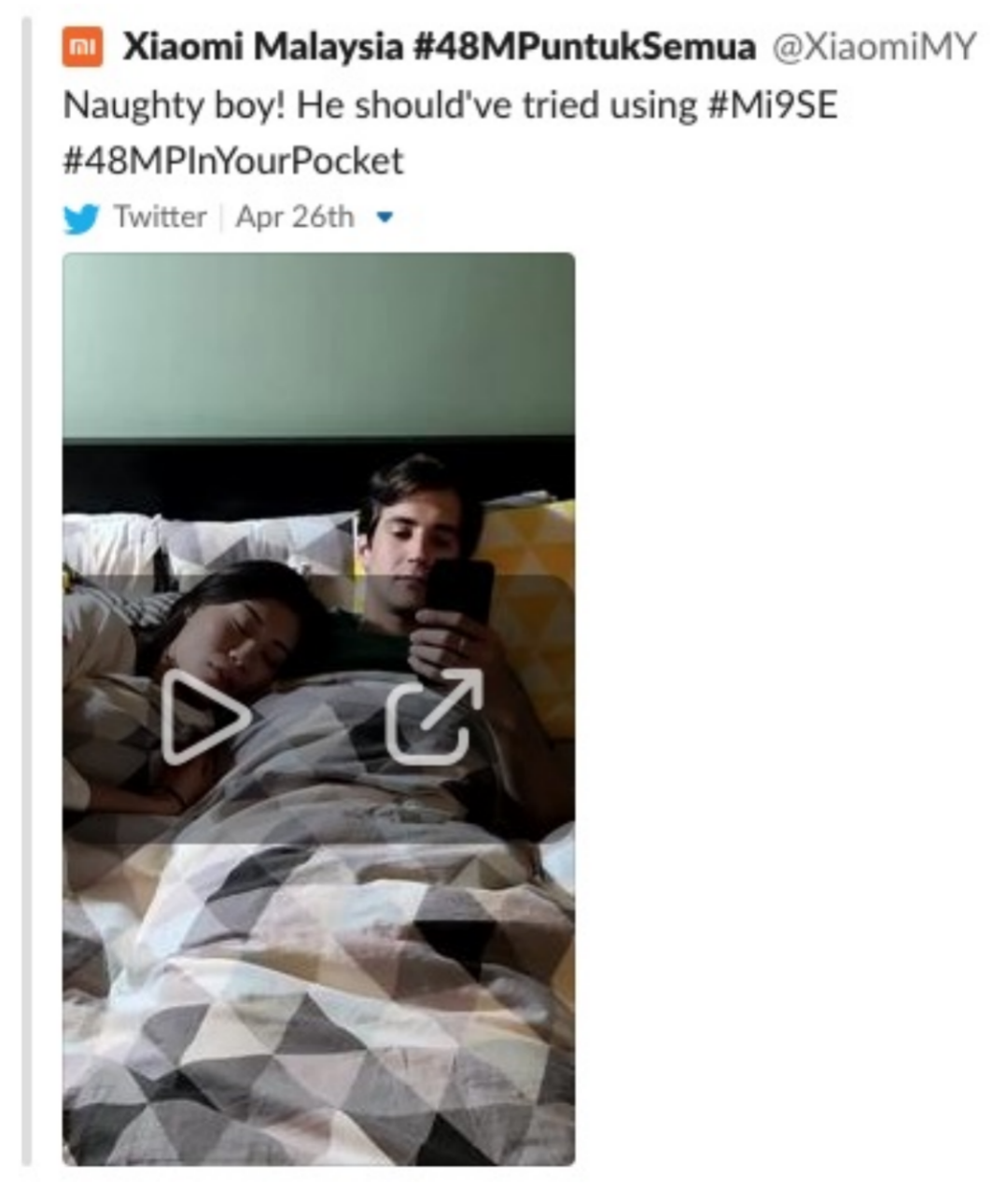 视频中,男主的女友/妻子正在身边熟睡,下一幕女主醒来,发现男主“想要出轨”。小米(马来西亚)想表示“小米手机能够阻止你出轨”还是“小米手机能够帮你更好的出轨”,就不得而知了。