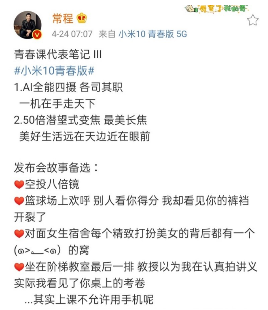 4月24日,小米手机高管常程一则关于“色情擦边球”的微博引爆微博舆论,虽然他火速删除了自己的微博文章,但是仍然持续发酵,一度冲上微博热榜。
