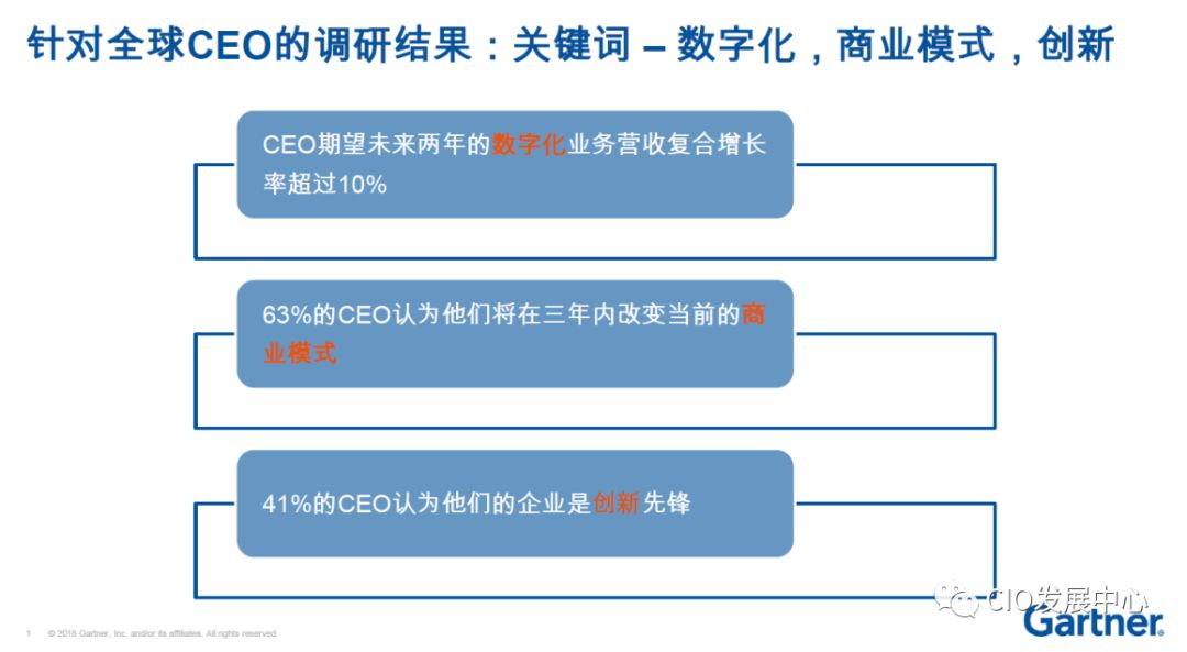 上边我们从CIO的视角、开发的视角、IT的视角,认为必须要实施敏捷和产品制。下面是Gartner对全球CEO的调研,看CEO对数字化、商业模式、以及创新的诉求,共同探讨数字化与企业有什么关系。