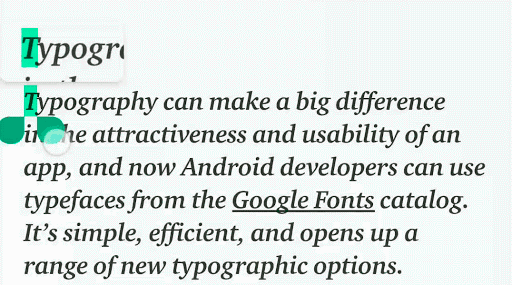 请阅读《Android P 中的新文本特性》,了解更多有关放大镜以及文本特性的相关信息,如 Precomputed Text、行高以及基线文本对齐。