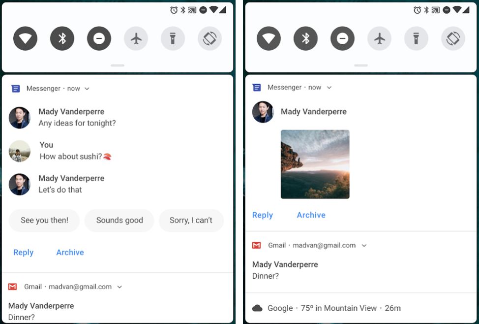 △ 在 MessagingStyle 通知中,您可以显示对话和智能回复 (左) 或添加图片和表情 (右)