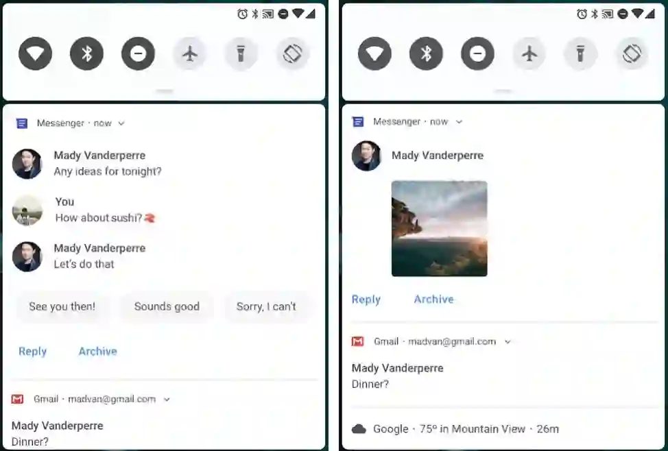 Android 9 进一步改善了通知的实用性与可操作性。消息类应用可以调用新的 MessagingStyle API 来显示对话,附加照片和表情,或者提供智能回复建议。再过不久,您就可以使用 ML Kit 在应用中生成智能回复。