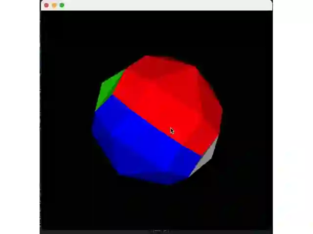 for (Triangle t : tris) {Vertex v1 = transform.transform(t.v1);Vertex v2 = transform.transform(t.v2);Vertex v3 = transform.transform(t.v3);v1.x += getWidth() / 2.0;v1.y += getHeight() / 2.0;v2.x += getWidth() / 2.0;v2.y += getHeight() / 2.0;v3.x += getWidth() / 2.0;v3.y += getHeight() / 2.0;// 计算需要处理的范围int minX = (int) Math.max(0, Math.ceil(Math.min(v1.x, Math.min(v2.x, v3.x))));int maxX = (int) Math.min(img.getWidth() - 1,Math.floor(Math.max(v1.x, Math.max(v2.x, v3.x))));int minY = (int) Math.max(0, Math.ceil(Math.min(v1.y, Math.min(v2.y, v3.y))));int maxY = (int) Math.min(img.getHeight() - 1,Math.floor(Math.max(v1.y, Math.max(v2.y, v3.y))));for (int y = minY; y <= maxY; y++) {for (int x = minX; x <= maxX; x++) {Vertex p = new Vertex(x,y,0);//针对每个顶点判断一次boolean V1 = sameSide(v1,v2,v3,p);boolean V2 = sameSide(v2,v3,v1,p);boolean V3 = sameSide(v3,v1,v2,p);if (V3 && V2 && V1) {img.setRGB(x, y, t.color.getRGB());}}}}g2.drawImage(img, 0, 0, null);