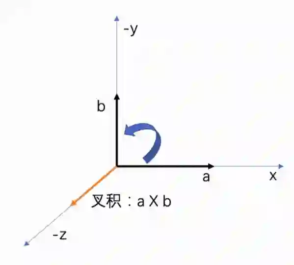 叉积的方向与两个初始向量正交,这个方向我们可以由右手螺旋定则确定。我们可以伸出右手作a向量到b向量的叉积我们可以发现叉出的方向是正朝上的(图一),而用右手螺旋定则b向量到a向量的叉积叉出的方向是正朝下的,这就是为什么a x b=-b x a。