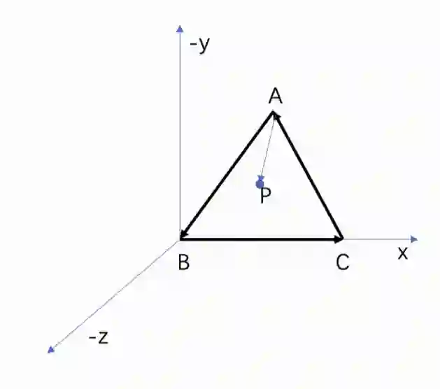 三角形的方向是逆时针的,从向量AB叉到向量AP叉出来的方向是-z,说明P点在AB的左侧;从向量BC叉到向量BP叉出来的方向是- z,说明P点在BC的左侧;从向量CA叉到向量CP叉出来的方向是-z,说明P点在AC的左侧,这就说明P点在三角形的内部。因为如果不在的话那么至少存在一条边使得P点在右侧(三角形是顺时针也没有问题,P点都在三角形的右边,我们只要保证P点一直在三条边的左边或者右边就可以说它在三角形的内部)。