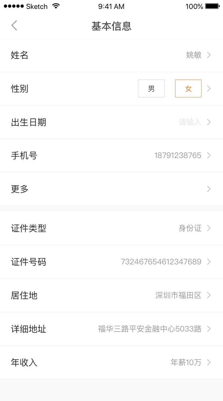 这个界面展示了基本信息,为什么这些信息成为基本信息,更多跳转到哪里,哪些信息应该放在更多里面?第一个品类的信息为什么和第二个区隔?是否因为第一个是基本五项信息,而第二个是证件住址信息?如何让用户更快填写这个界面,能否每个条目输入后自动切换到下个条目?