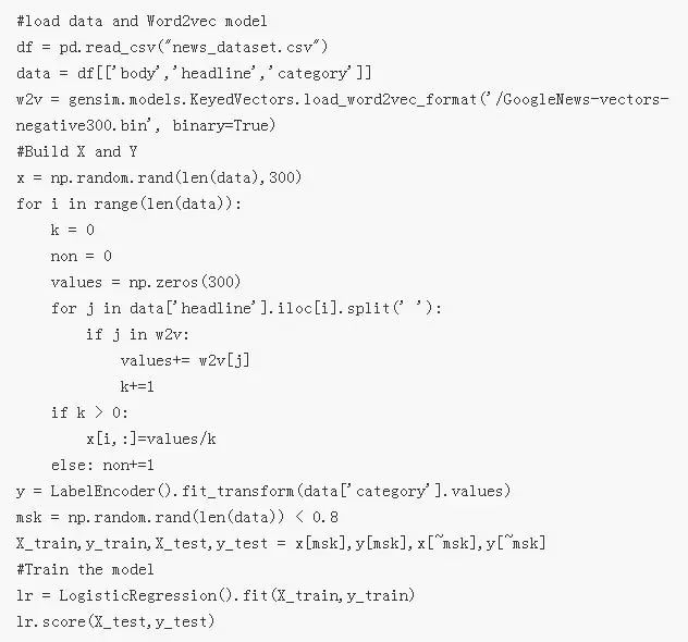 我们可以使用 Gensim 训练我们自己的 Word2Vec 模型,但是在这个例子中我们会使用一个 Google 预训练 Word2Vec 模型,它基于 Google 的新闻数据而建立。在将每一个单词表征为向量后,我们会将一个句子(文章标题)表征为其单词(向量)的均值,然后运行 logistic 回归对文章进行分类。