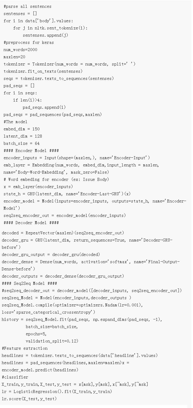 我们的自编码器是一个简单的序列到序列结构,由一个输入层、一个嵌入层、一个 LSTM 层,以及一个 softmax 层组成。整个结构的输入和输出都是标题,我们将使用 LSTM 的输出来表征标题。在得到自编码器的表征之后,我们将使用 logistics 回归来预测类别。为了得到更多的数据,我们会使用文章中所有句子来训练自编码器,而不是仅仅使用文章标题。