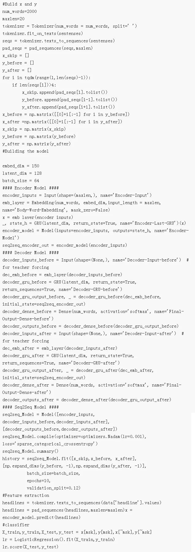 在 2015 年关于 skip-thought 的论文《Skip-Thought Vectors》中,作者从语言模型中获得了同样的直觉知识。然而,在 skip-thought 中,我们并没有预测下一个单词,而是预测之前和之后的句子。这给模型关于句子的更多语境,所以,我们可以构建更好的句子表征。您可以阅读这篇博客(https://medium.com/@sanyamagarwal/my-thoughts-on-skip-thoughts-a3e773605efa),了解关于这个模型的更多信息。