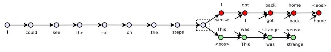 我们将构造一个类似于自编码器的序列到序列结构,但是它与自编码器有两个主要的区别。第一,我们有两个 LSTM 输出层:一个用于之前的句子,一个用于下一个句子;第二,我们会在输出 LSTM 中使用教师强迫(teacher forcing)。这意味着我们不仅仅给输出 LSTM 提供了之前的隐藏状态,还提供了实际的前一个单词(可在上图和输出最后一行中查看输入)。