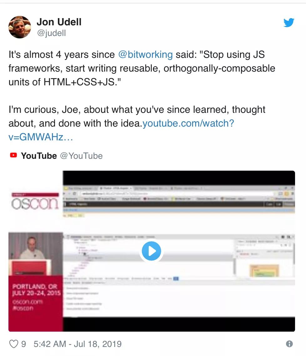 大约 5 年前开始我就不再用 JS 框架了,最近 Jon Udell 问我近况如何: