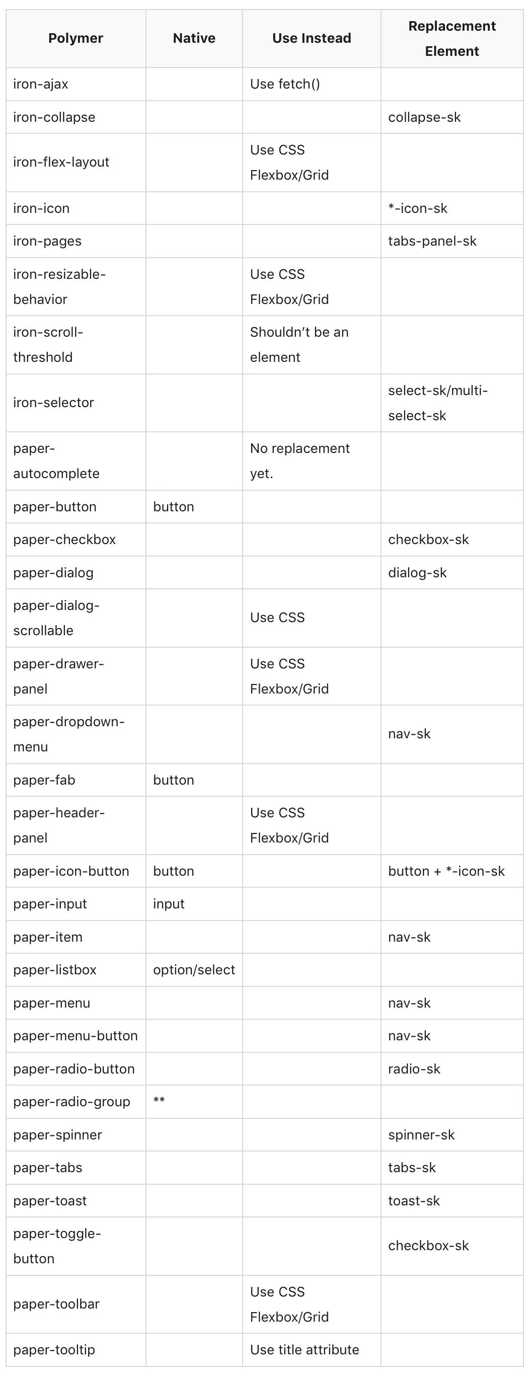 在下表中,“Native”一列中我们可以用调好样式的原生元素替代;“Use Instead”一列是我们可以用来代替自定义元素的选项。这里你会注意到很多元素都可以用 CSS 替换。最后一列“Replacement Element”是我们用来替换 Polymer 元素的元素名称: