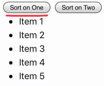如果用户按下“Sort on One”按钮,则 #sortable 的子项按其 data-one 属性的字母顺序排序。如果用户按下“Sort on Two”按钮,则 #sortable 的子项按其 data-two 属性的字母顺序排序。