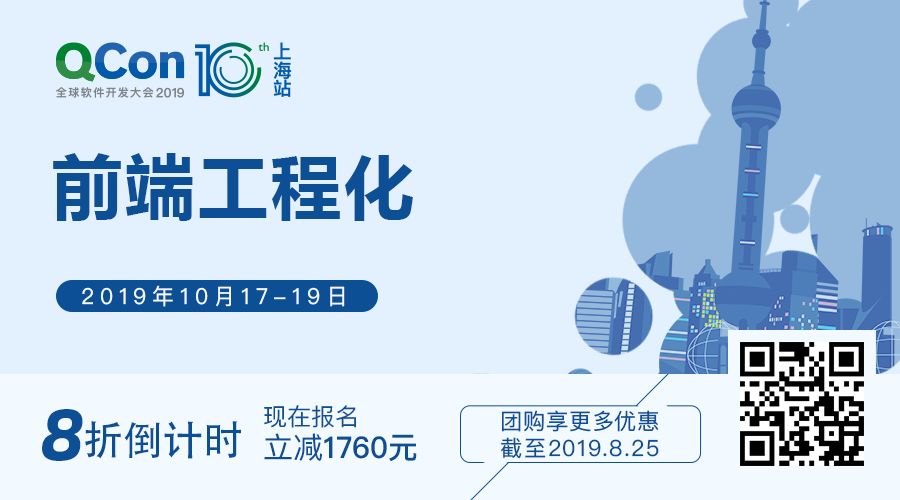 点击「阅读原文」或识别二维码来 QCon 上海 2019 看各个互联网公司一系列经历实战考验的前端实践。大会 8 折报名中,立减 1760 元,有任何问题欢迎联系票务小姐姐 Ring:17310043226(微信同号)
