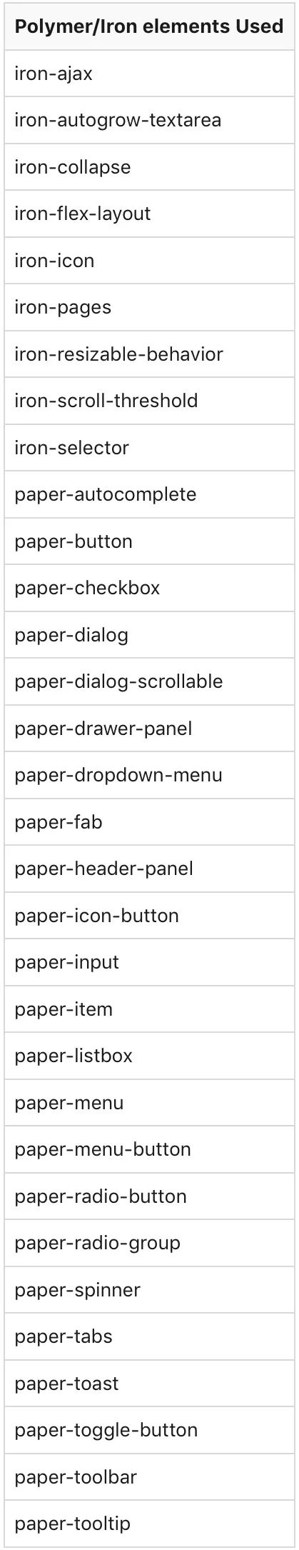 我做的第一件事是检查每个项目并记下各个项目中使用的所有 Polymer 元素。如果我要替换 Polymer,至少应该知道有多少元素需要重写。列出来的单子在很多方面都出乎意料,首先就是这个列表其实很短: