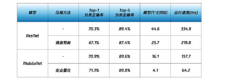 接下来,我们给出经 PocketFlow 压缩后的模型在移动端的实际运行效率对比,从下表中可以看到,对于 ResNet 模型,我们能把运行时间从原来的 334 ms 降到现在的 220 ms 左右,相当于把运行时间降低到原来的 60%~70%,精度损失大约为两个百分点;MobileNet 模型尺寸可以降低到原来的四分之一,精度方面相对于原始模型甚至还有小幅度的提升。