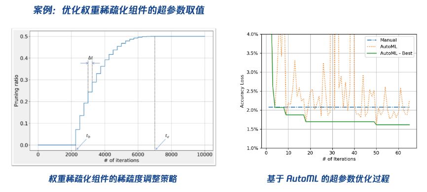 下面给出了一个具体的实验对比结果,我们通过 AutoML 算法,自动地选择权重稀疏化组建中的几个超参数取值组合。我们当然也可以基于过往经验去选择,但是需要一定的专业知识,并且可能会很耗时,因此希望这个过程可以更加自动化。从下图中可以看到,我们基于 AutoML 算法大约是在第 10 次迭代中就可以达到比手工调参更好的结果。