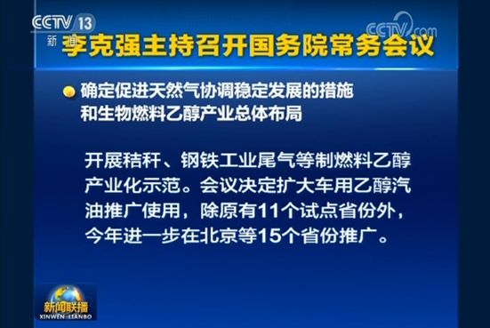 8月22日的国务院常务会议明确指出:“为发展绿色能源,并消化部分粮食品种过多库存,国务院常务会议确定了生物燃料乙醇产业总体布局,坚持控制总量、有限定点、公平准入,适度布局粮食燃料乙醇生产,加快建设木薯燃料乙醇项目,开展秸秆、钢铁工业尾气等制燃料乙醇产业化示范。会议决定扩大车用乙醇汽油推广使用,除原有11个试点省份外,今年进一步在北京等15个省份推广。”