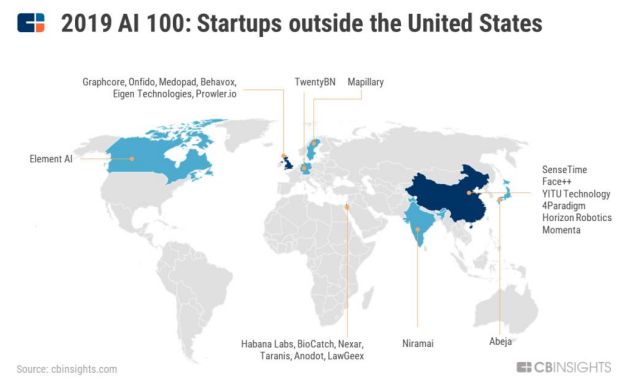 百强榜单中,除中国企业外,以色列有6家,英国有6家,加拿大、德国、瑞典、日本、印度的AI创业公司均为1家,其余超过70家企业均来自美国。