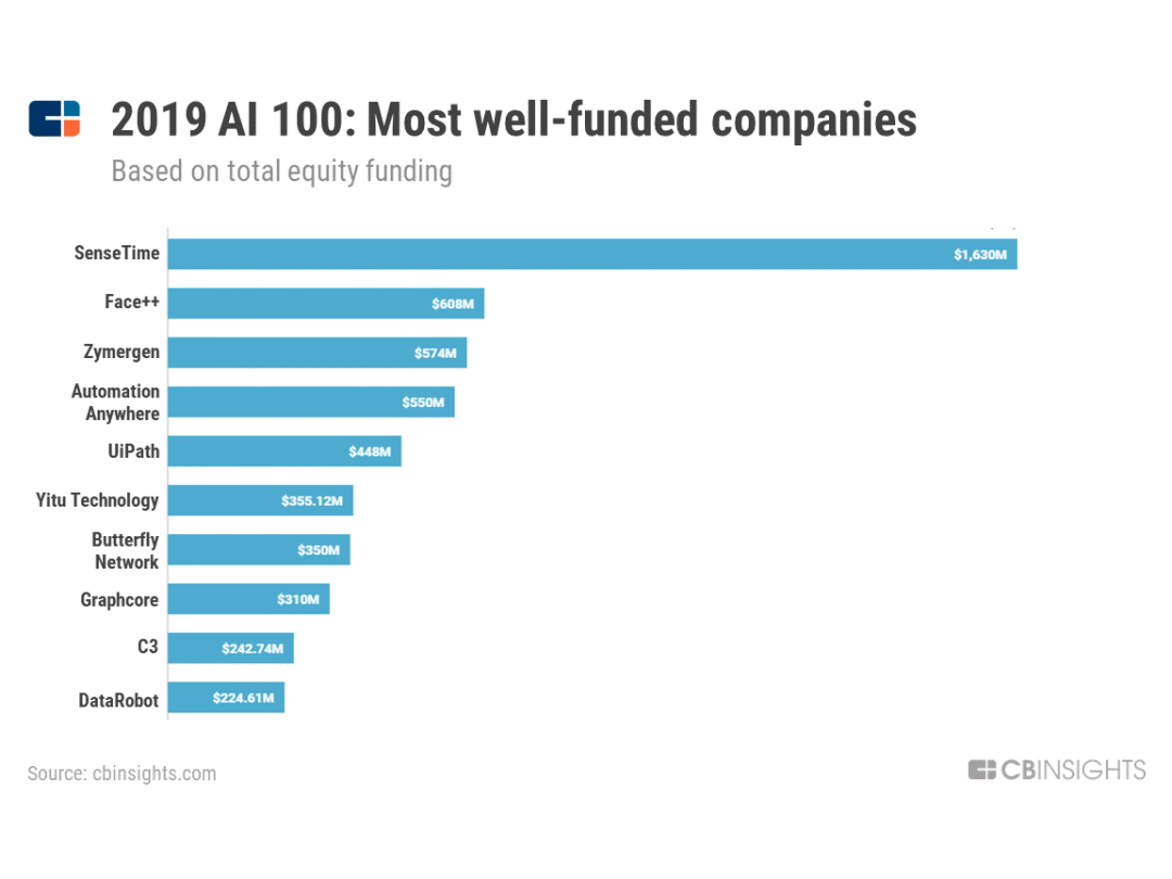 CB Insights报告指出,在这11家独角兽企业中,商汤科技和旷视科技资金最充足,这在很大程度上得益于政府合同,它们分别吸引了超过16亿和6亿美元投资。