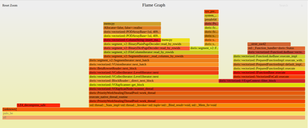 在 Doris 1.1.2 版本中使用 Like 语句进行字符串模糊匹配查询时,Doris 底层其实是使用了标准库中的std::search()函数对存储层读出的数据进行逐行匹配,过滤掉不满足要求的数据行,完成 Like 语句的模糊匹配。通过调研和对比测试发现,GLIBC 库中的std::strstr()函数针对字符串匹配比std::search()函数有 1 倍以上的性能提升。最终我们使用std::strstr()函数作为 Doris 底层的字符串匹配算法,将 Doris 底层字符串匹配的性能可以提升 1 倍。