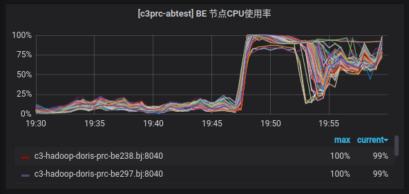 查询下发到 Doris 1.1.2 版本所在的集群,CPU 使用率最多只能打到 50% 左右,但是完全相同的一批查询下发到线上 Doris 0.13 版本的集群,CPU使用率可以打到接近 100%。因此推测 Doris 1.1.2 版本在小米 A/B 实验场景中将机器的 CPU 利用不起来造成了查询性能大幅度降低。